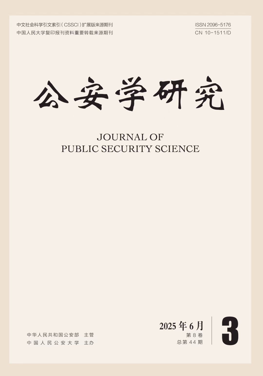 Journal of Public Security Science (bimonthly), launched in 2018, focuses on policing strategy, fundamental theories of police science, national security, and theoretical innovations across various sub-disciplines and interdisciplinary studies within police science. With the mission of constructing a police science discipline system with Chinese characteristics, it has gradually evolved into a theoretical forefront for policing research. The journal has been included in the “AMI New Journal Inventory”, selected among the first batch of “Young Scholar-Friendly Journals”, and continuously listed as a CSSCI Extended Version source journal since 2023.