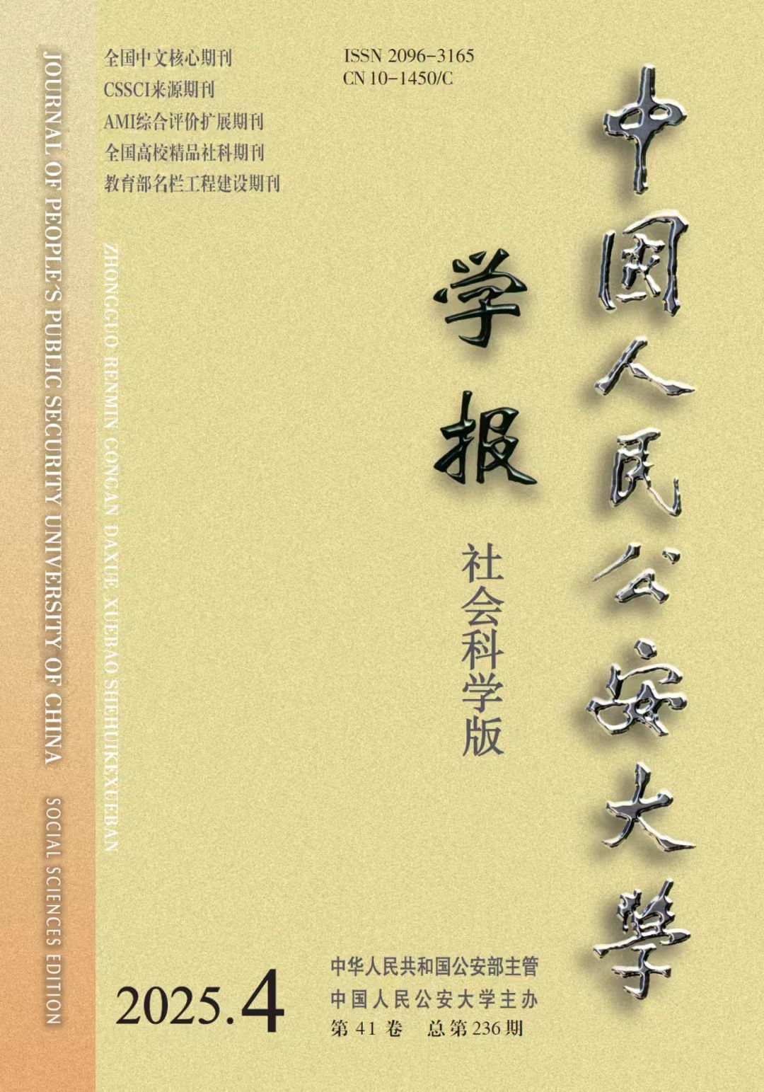 Journal of People’s Public Security University of China (Social Sciences Edition) (bimonthly), first published in 1985, focuses on fundamental theories and applied research in public security disciplines such as criminology, investigation, law, police administration and public order maintenance. It has been selected as a Chinese Core Journal, an AMI Comprehensive Evaluation Extended Journal in Chinese Humanities and Social Sciences, a source journal of CSSCI, and a Key Reprint Source Journal of the Copy Press. The journal has been honored with the titles of “National Top 100 Social Sciences Journal”, “National High-Quality University Social Sciences Journal”, and the “Featured Column of Ministry of Education (Criminology Research Section)”. It was also selected among the first batch of “Young Scholar-Friendly Journals”.